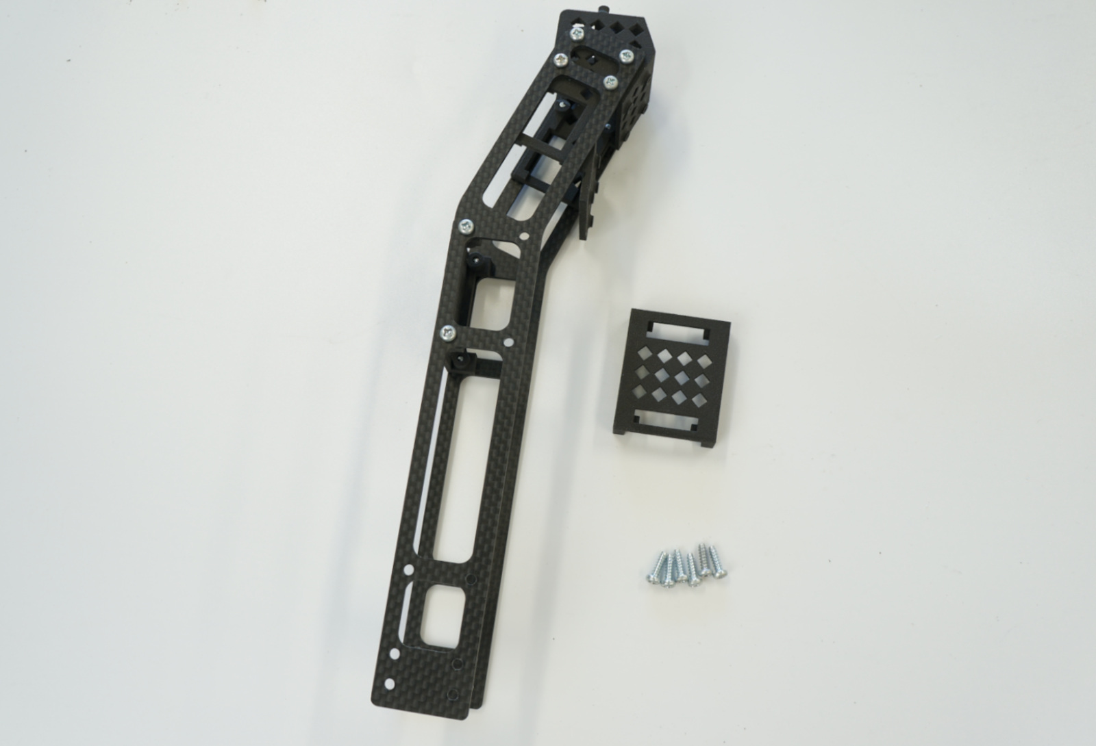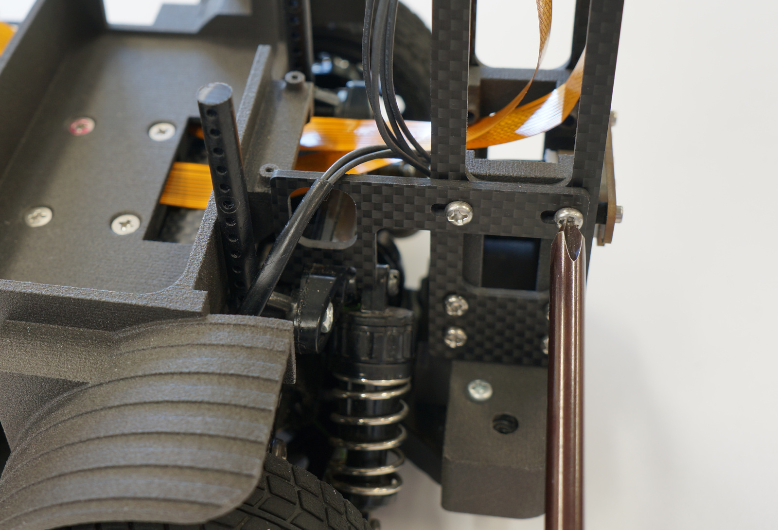 なべねじM3x10を4本、ロック付きナット(黒)M3でフロントマウントをカーボンベースに取り付けします。
