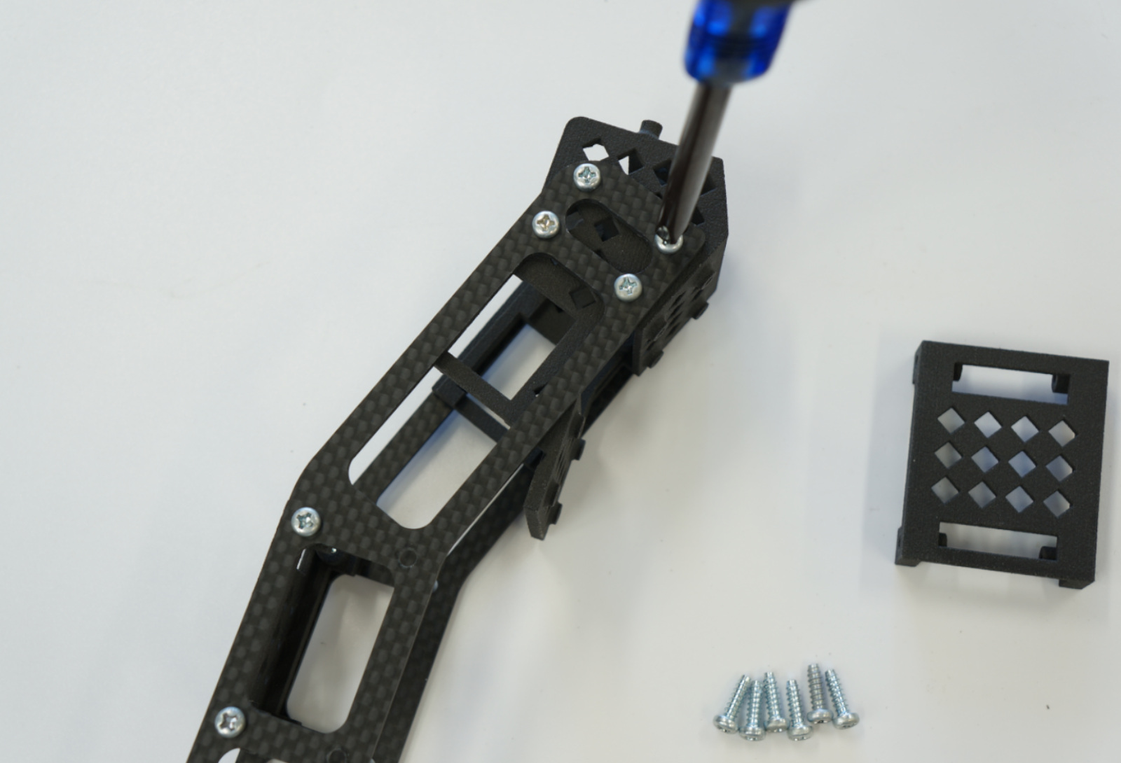 TT-02エキスパートビルドの装着されていたタッピングねじを使いRCカーに取り付けます。を使い車体とプレートを結合させます。