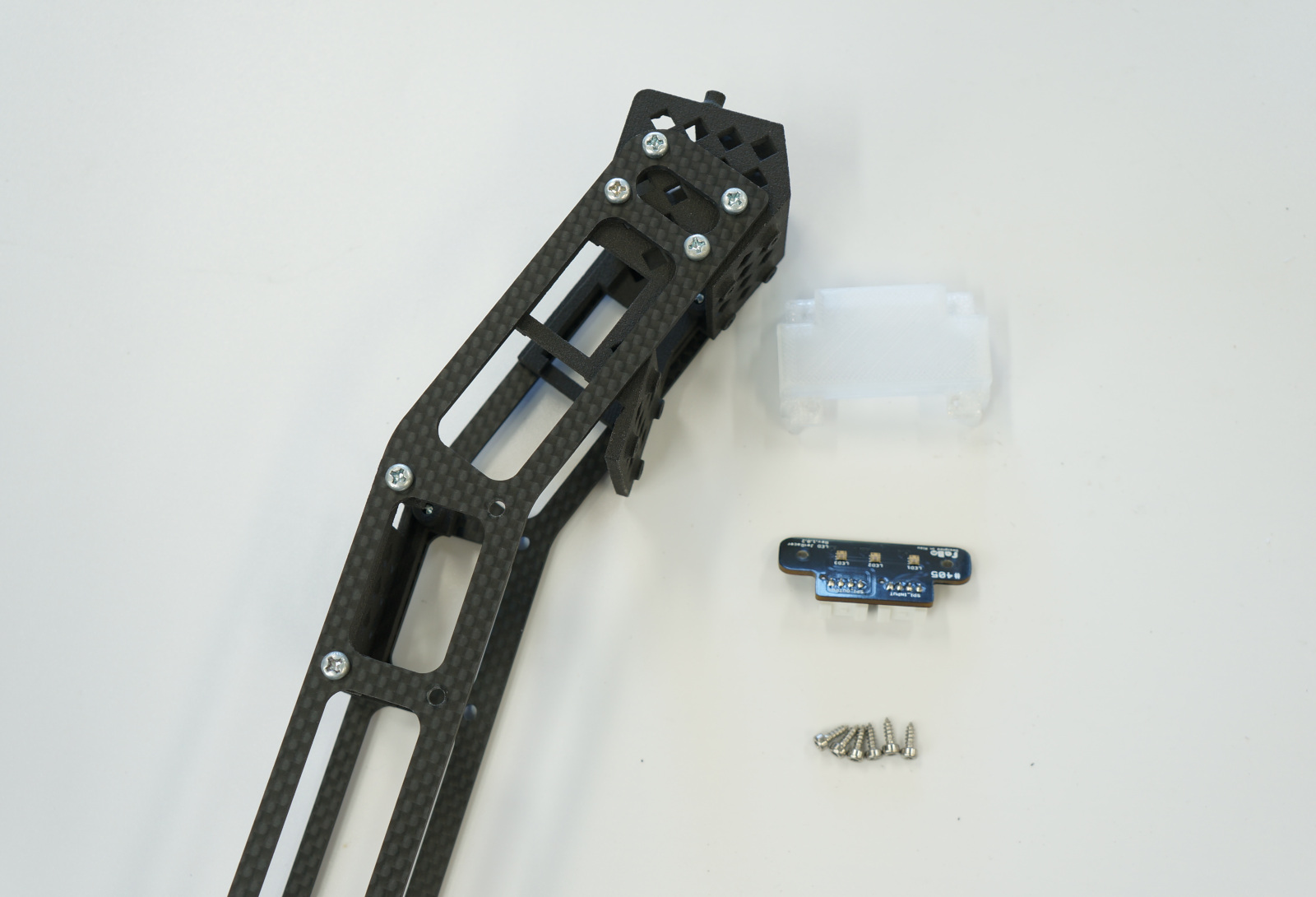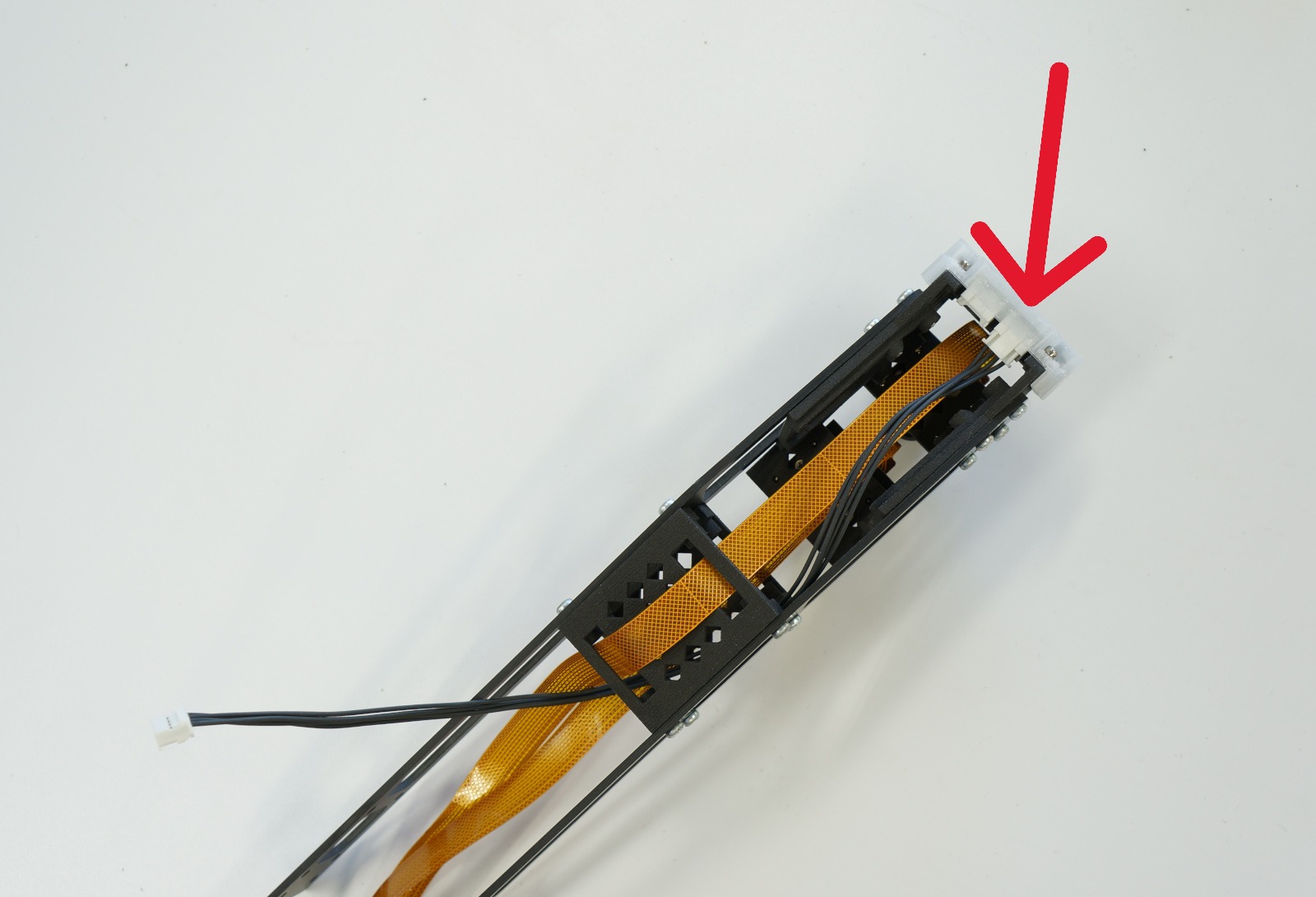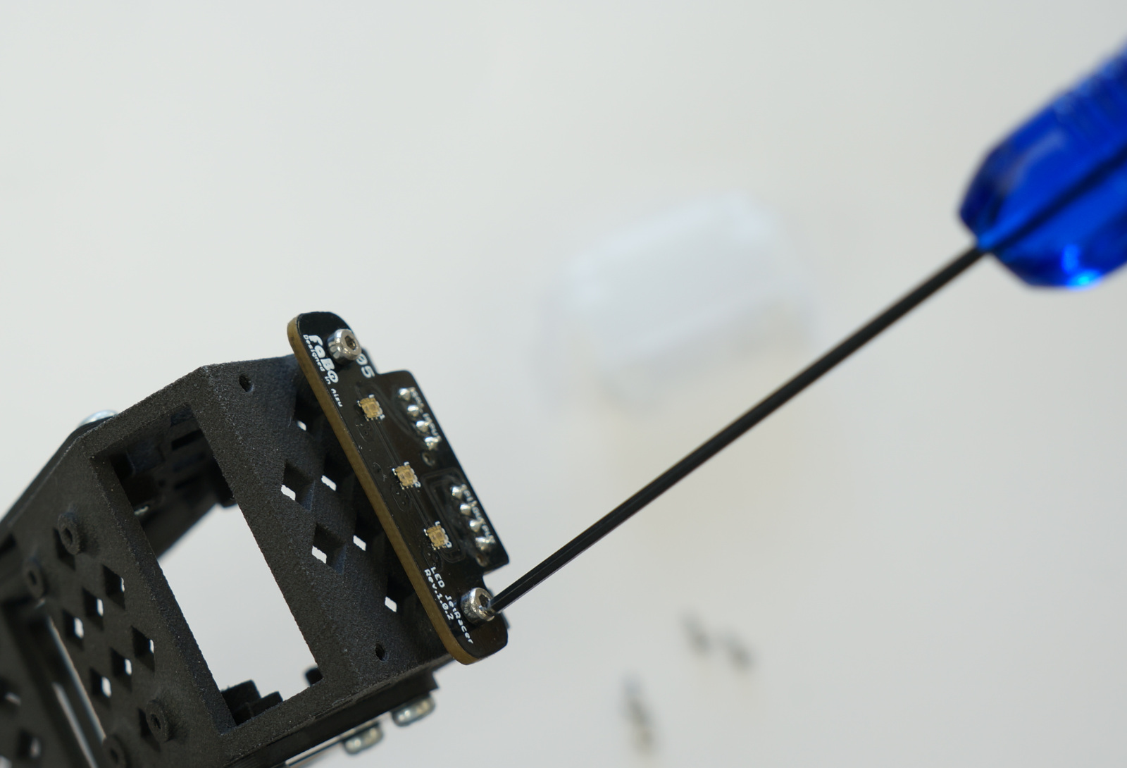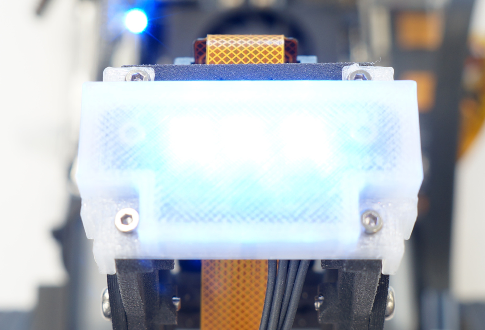 LEDボードを取り付けます。LEDケーブル長い方28cm(4pin)をSPI_INPUT側に接続し、カメラベースに取り付け、LEDボードを下のようにタッピングM2 x 6を使い固定取り付けします。