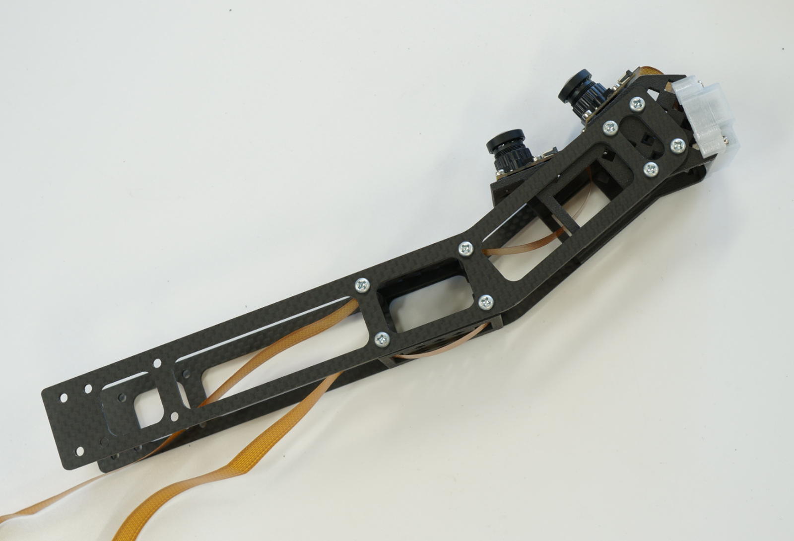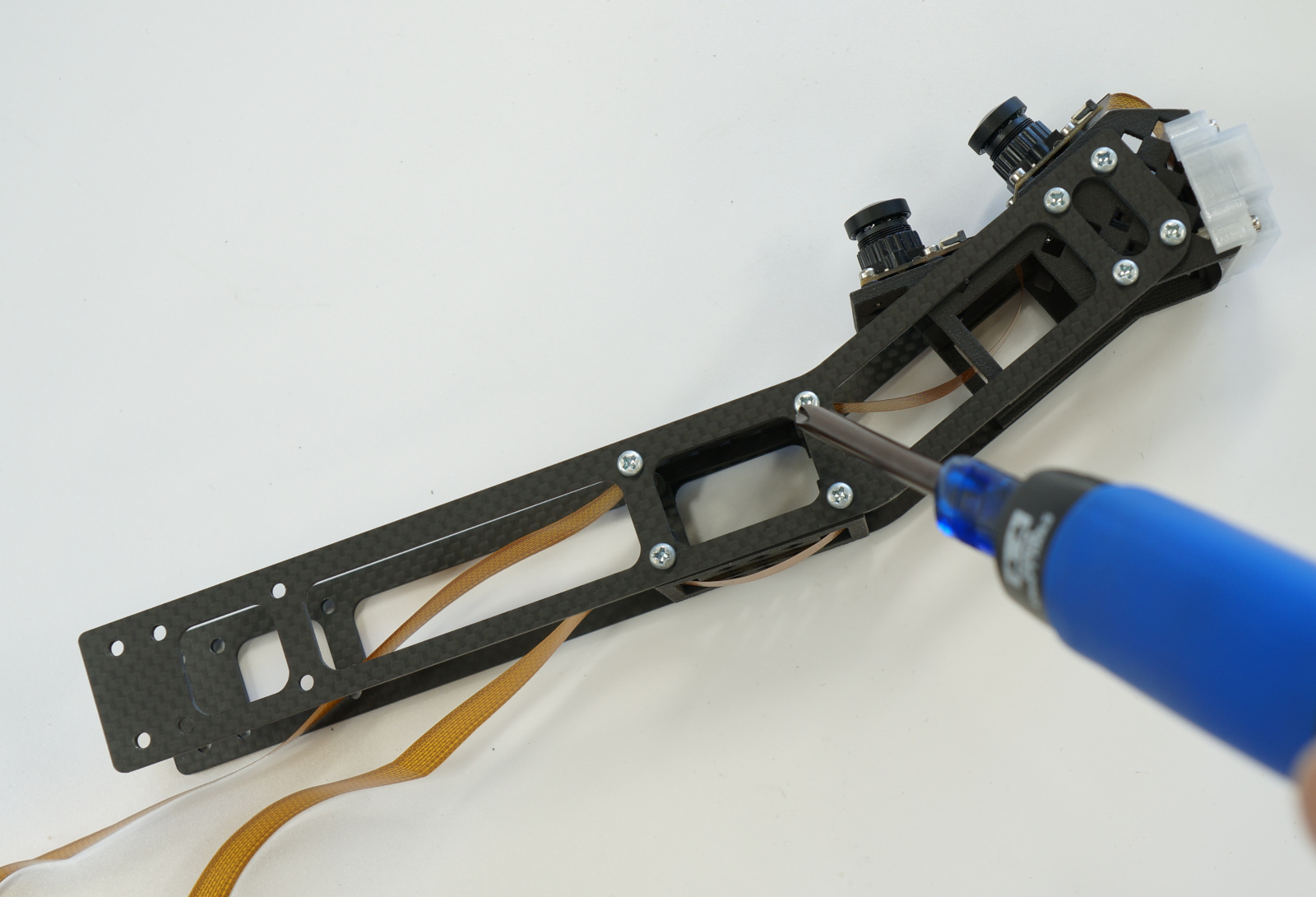 カメラマウントを装着します。タッピングビス M3 X 10で両側にカメラマウントとケーブルホルダー2個のうち1個を取り付けます。