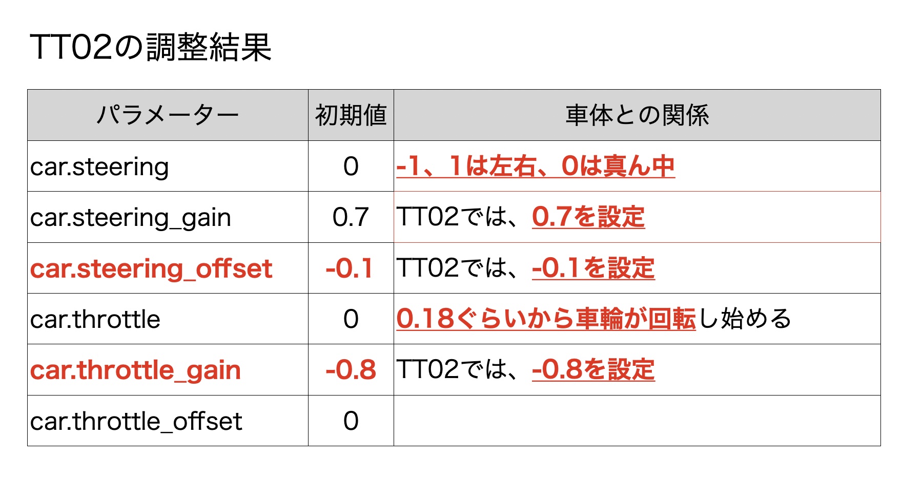 | car.steering_offset | オフセット | 前輪の初期値が曲がっている場合に調整 |